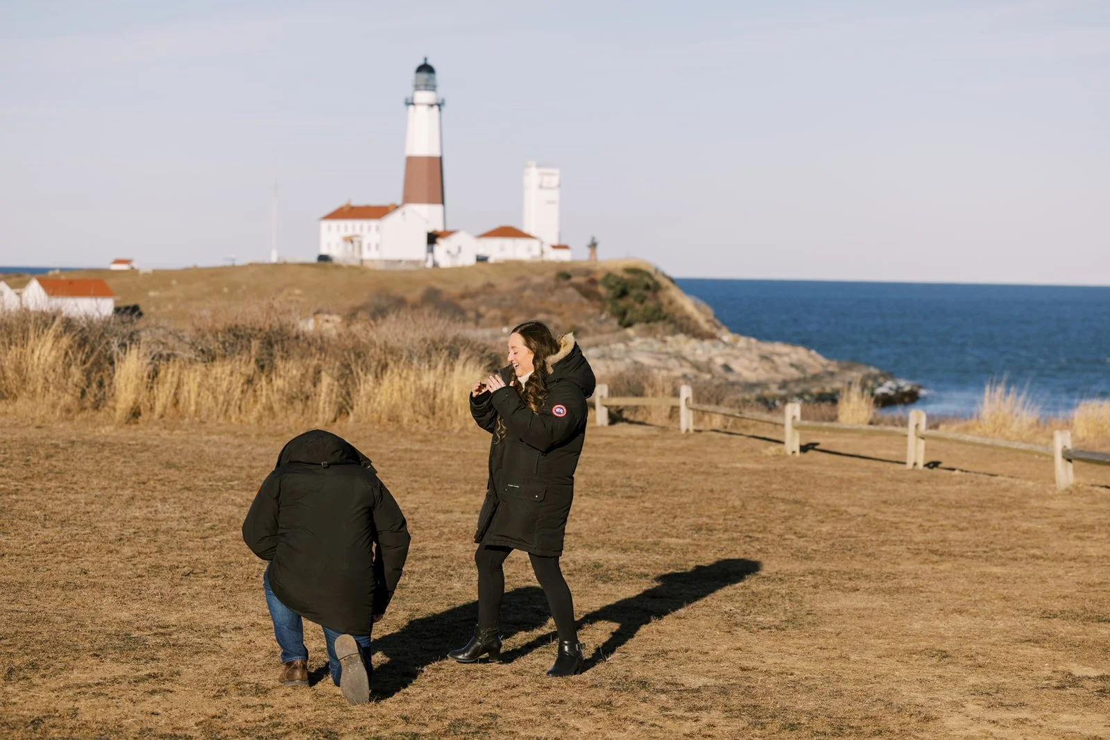 Last Saturday in Montauk was one of those winter days that surprises you. Cold, yes, but clear, bright, and calm in a way that makes the beach feel quiet and personal. The forecast called for sunshine, chilly temps in the low 20s, and barely any wind, which meant the light was beautiful and the shoreline felt almost untouched. Honestly, it couldn’t have been a better setting for Samara and Adam’s proposal.